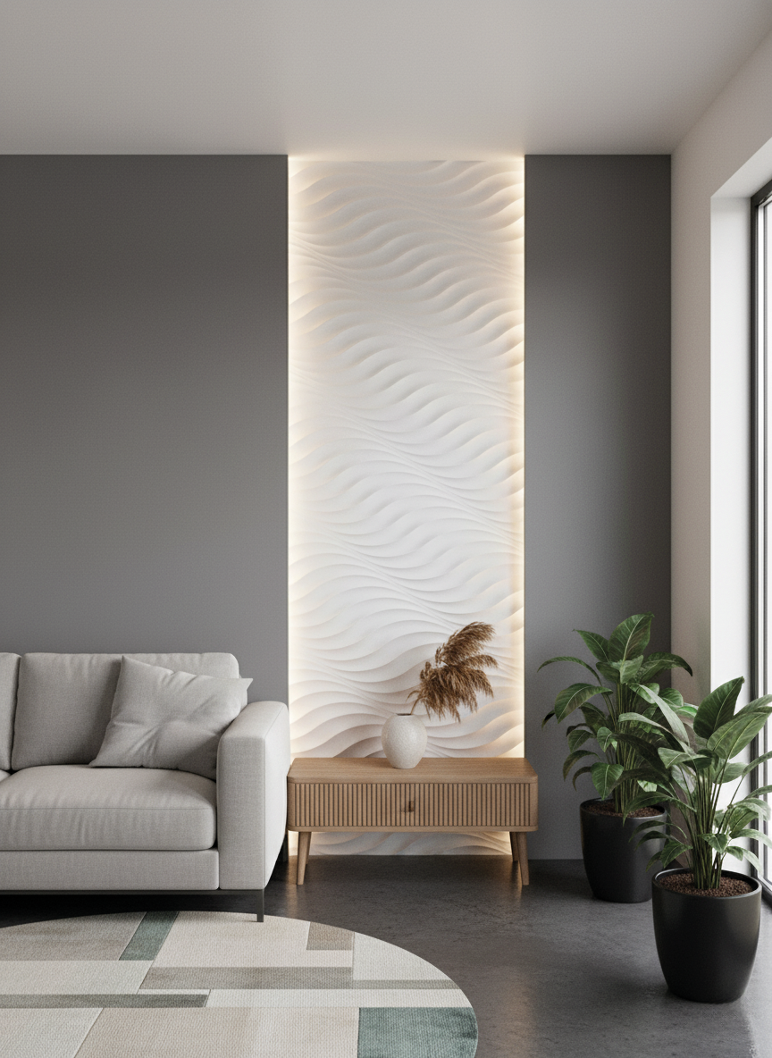 Le panneau référence CL12 présente un joint creux d’une largeur de 1 cm sur un côté. Pour un résultat sans raccord apparent (bord à bord), ce joint doit être découpé. Revêtement mural décoratif en staff, Ondes est conçu pour une pose simple et rapide.